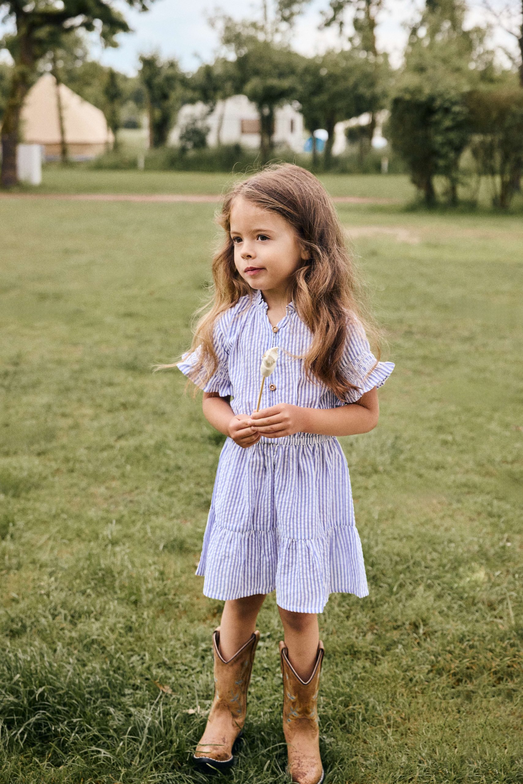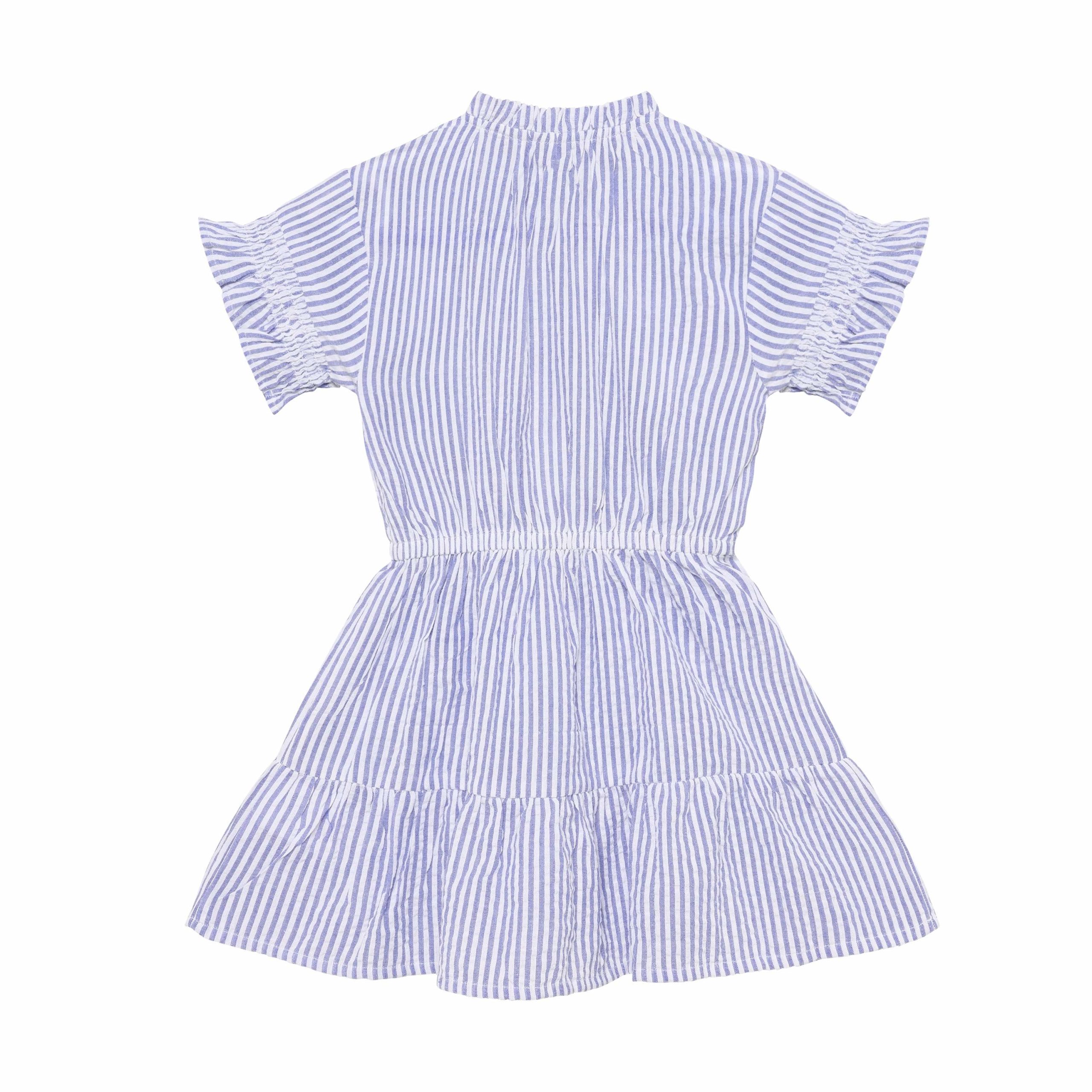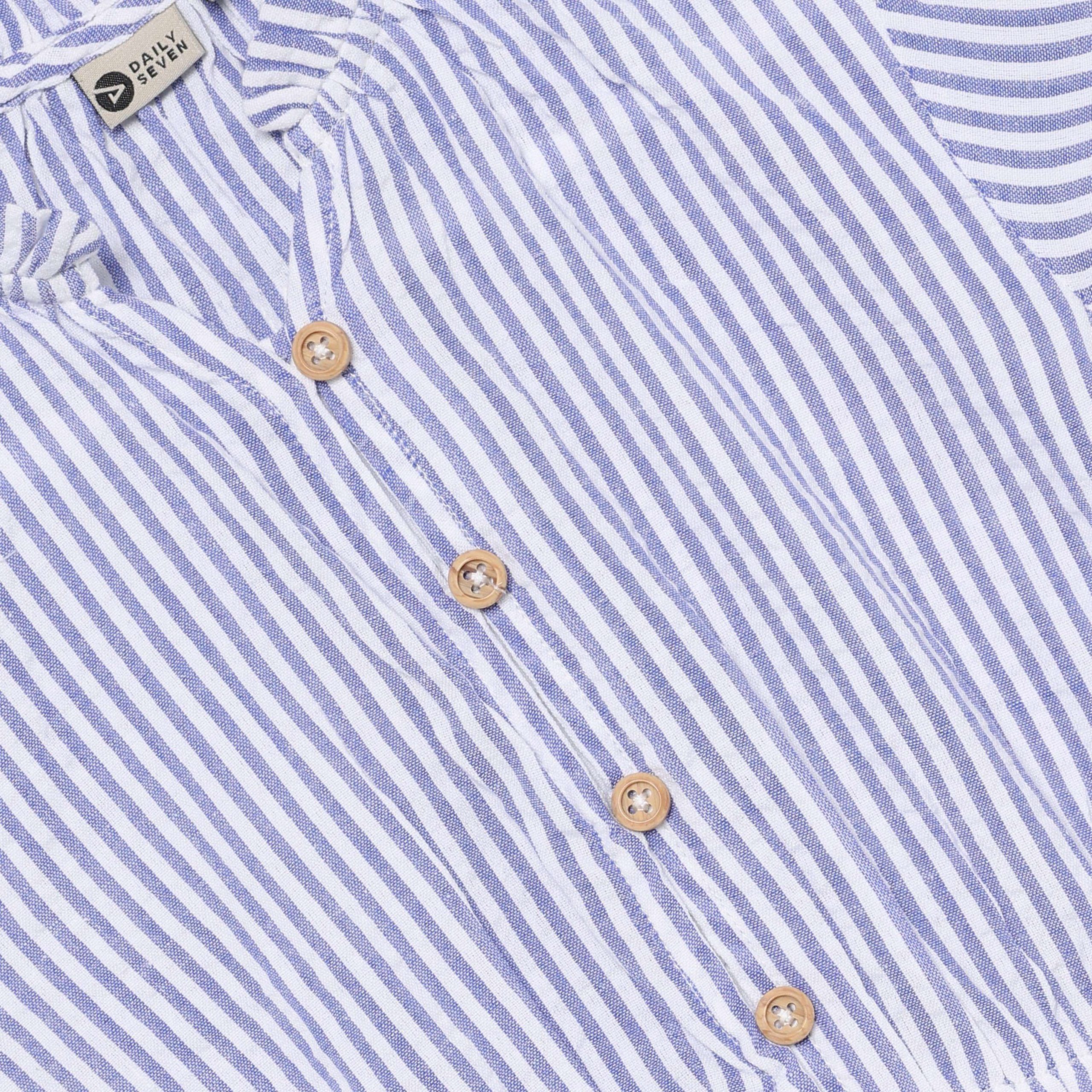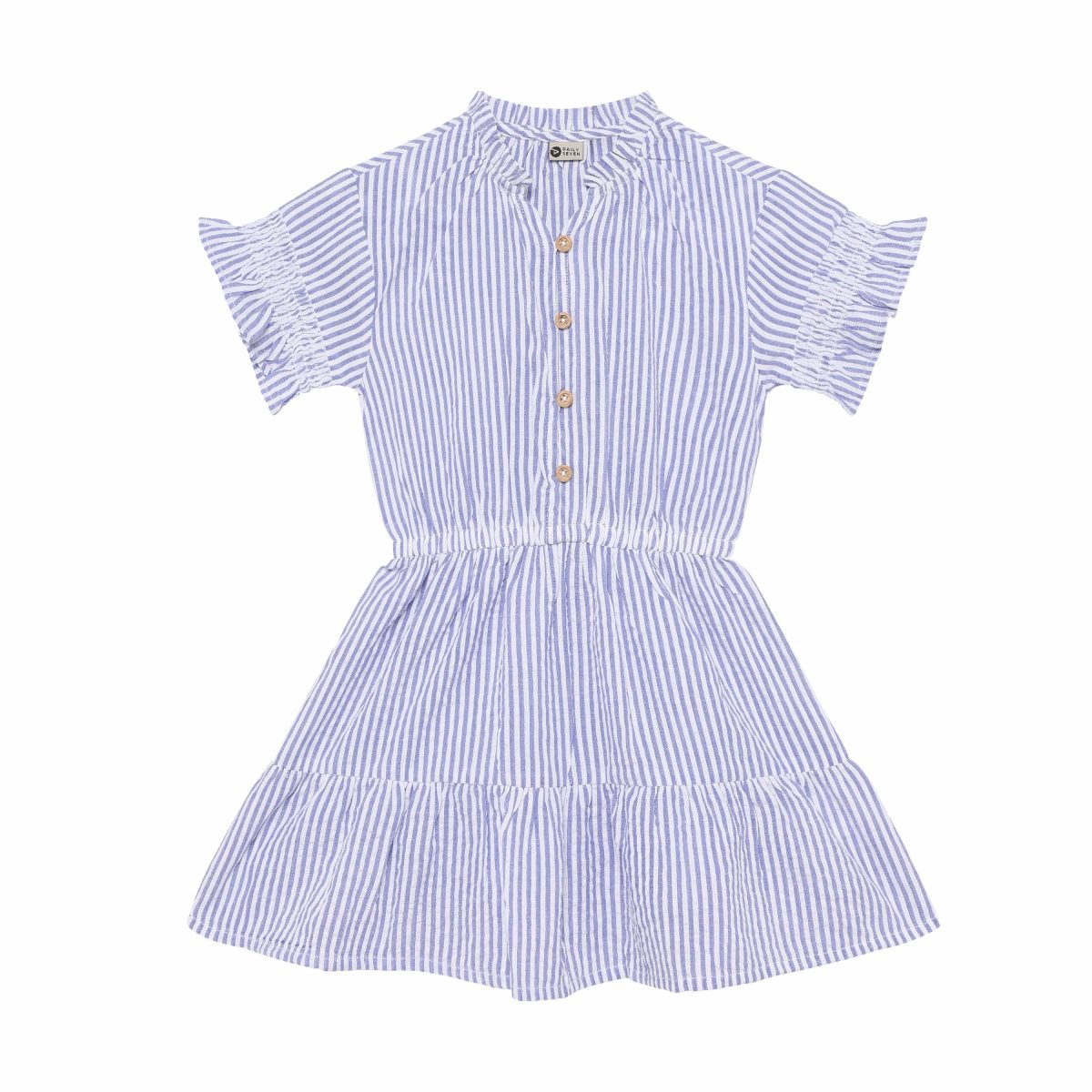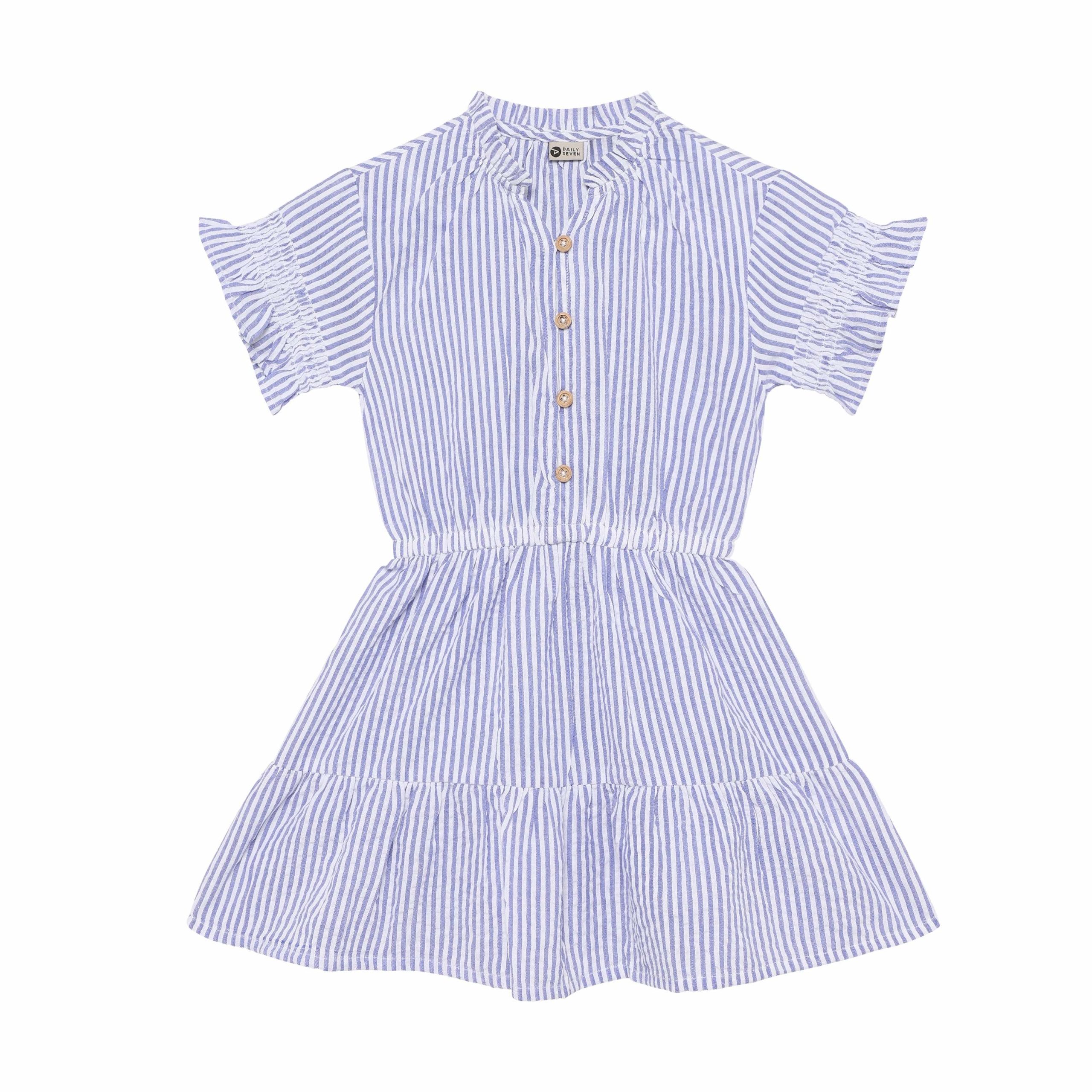 Jurk met korte mouwen van Daily7Kids. De jurk heeft een all-over streepjesprint. De kraag en mouwen zijn afgewerkt met elastiek en de mouwen zijn bovendien versierd met een ruchesrand. De jurk heeft een elastische taille en sluit met knoopjes van de kraag tot de taille. De jurk is gemaakt van 100% katoen.